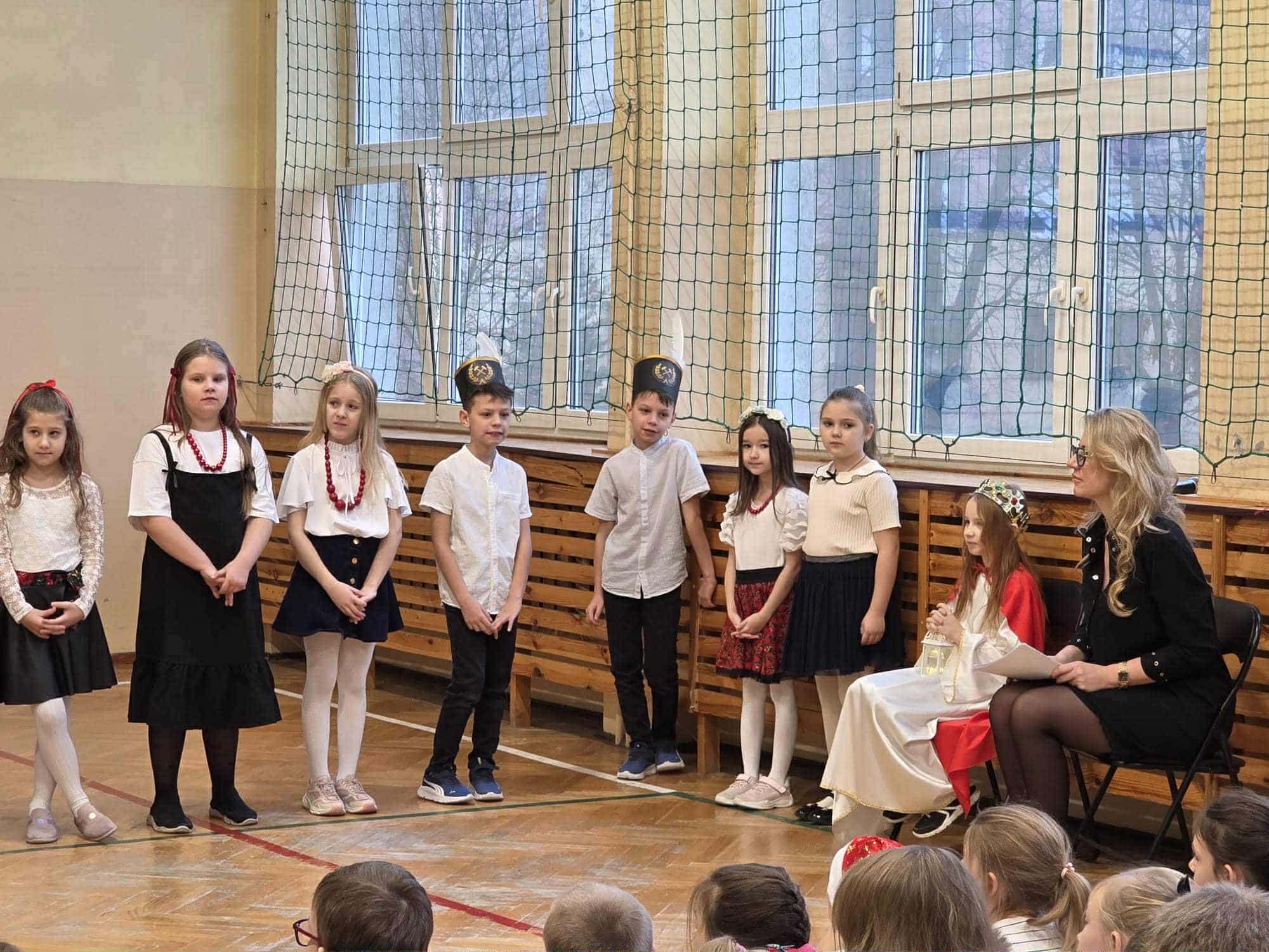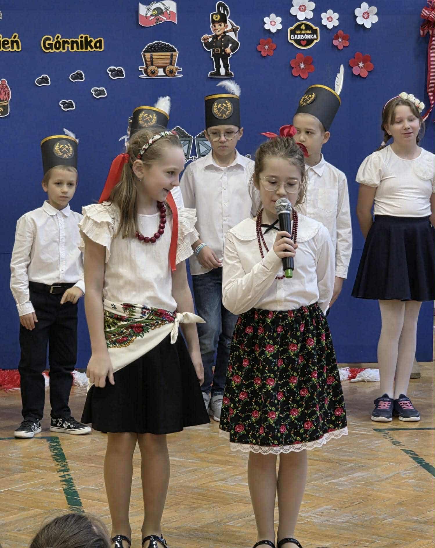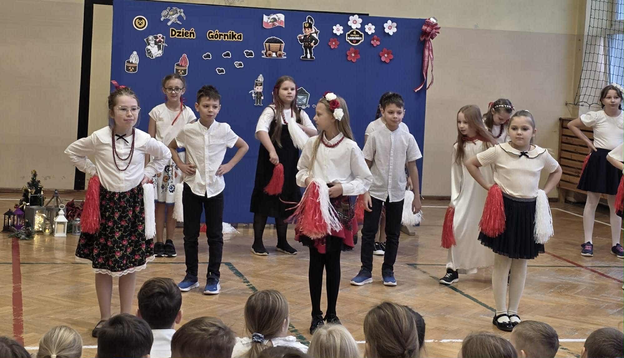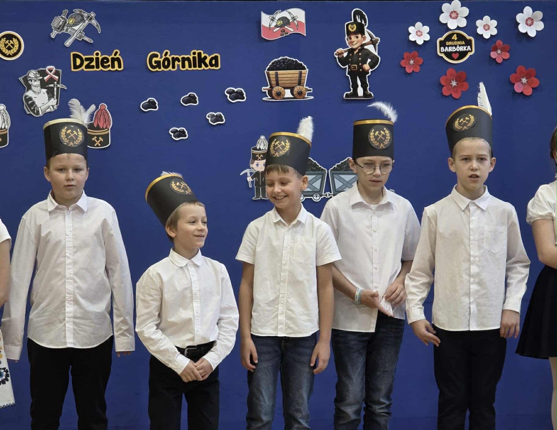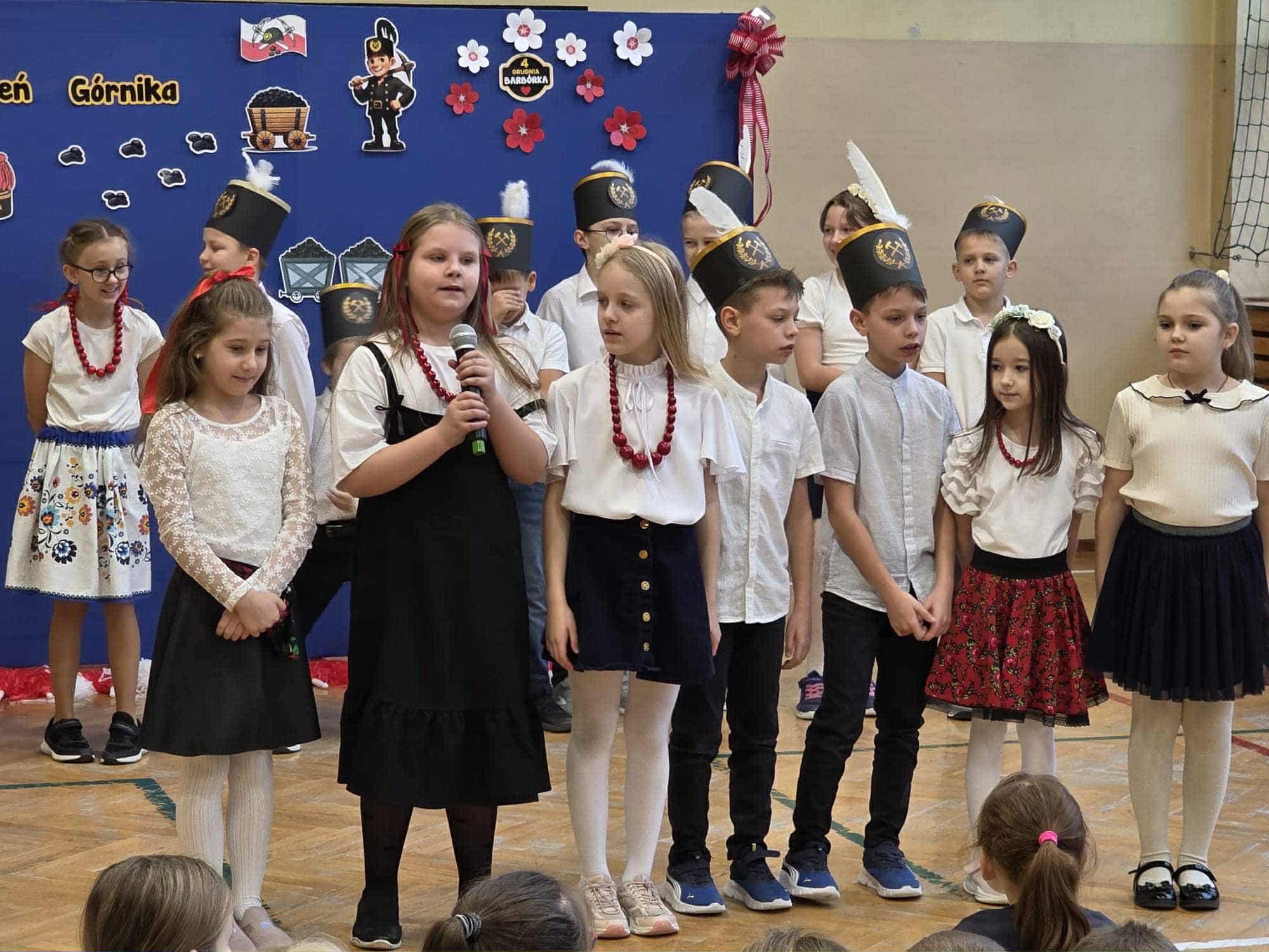 Poprzez wiersze, piosenki i tańce uczniowie przybliżyli koleżankom i kolegom z klas I - III uznanie i szacunek dla pracy górników.