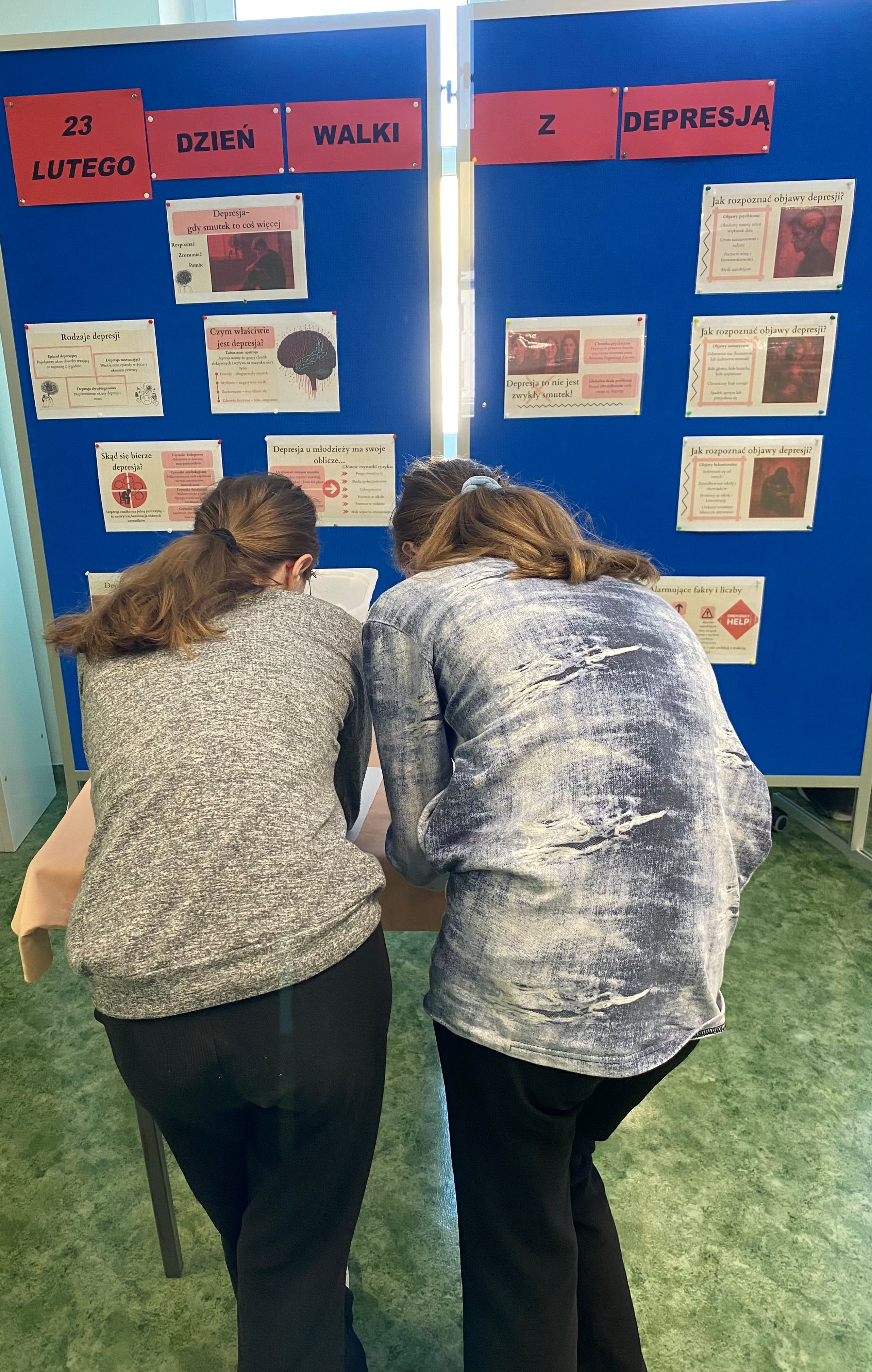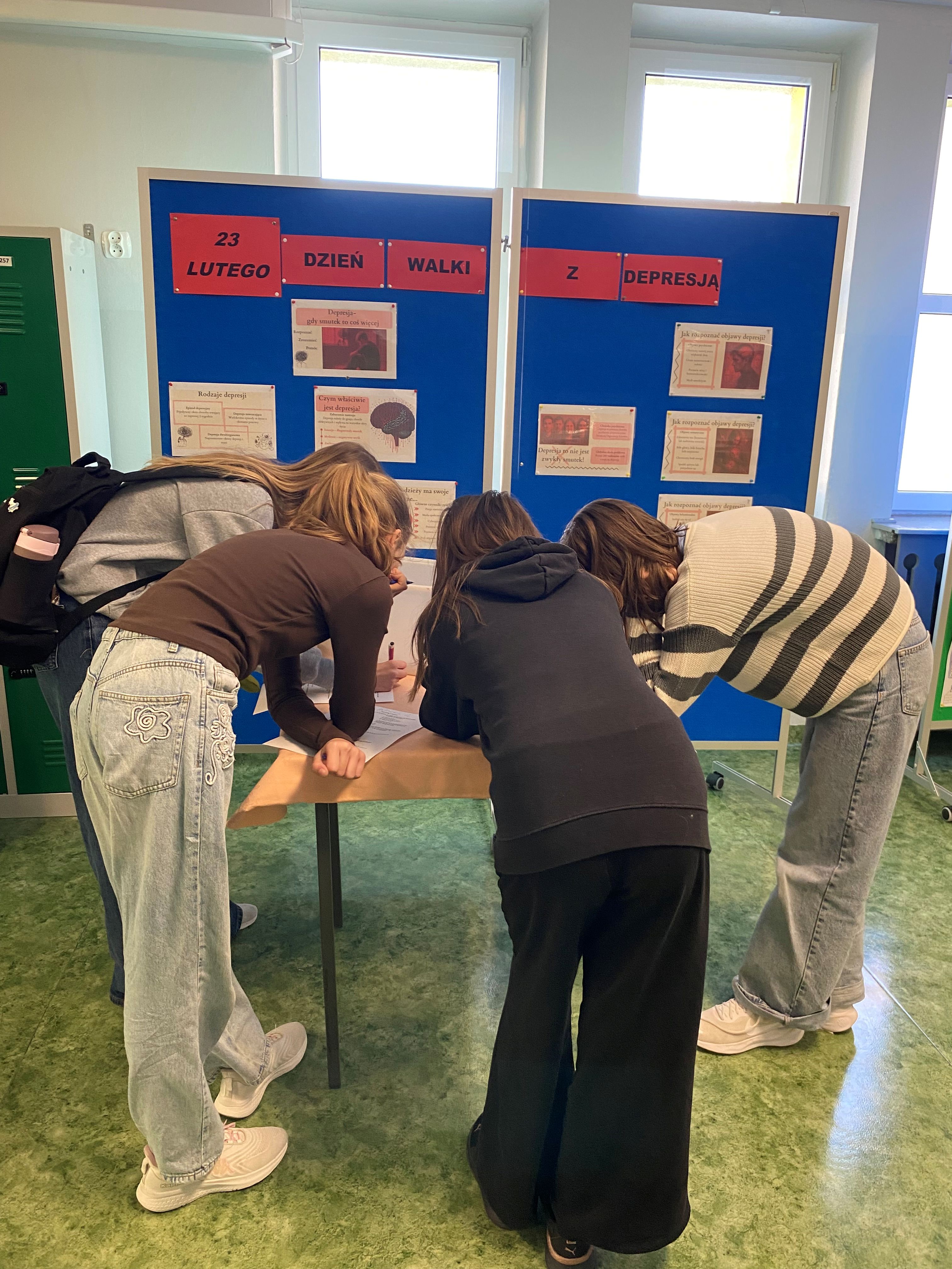 W naszej szkole z okazji Międzynarodowego Dnia Walki z Depresją została przygotowana gazetka informacyjna, która zawierała najważniejsze treści na temat depresji – jej objawów, sposobów szukania pomocy oraz znaczenia wsparcia i rozmowy w trudnych chwilach. Celem gazetki było zwiększenie świadomości uczniów na temat zdrowia psychicznego oraz uwrażliwienie na potrzeby osób zmagających się z trudnościami emocjonalnymi.