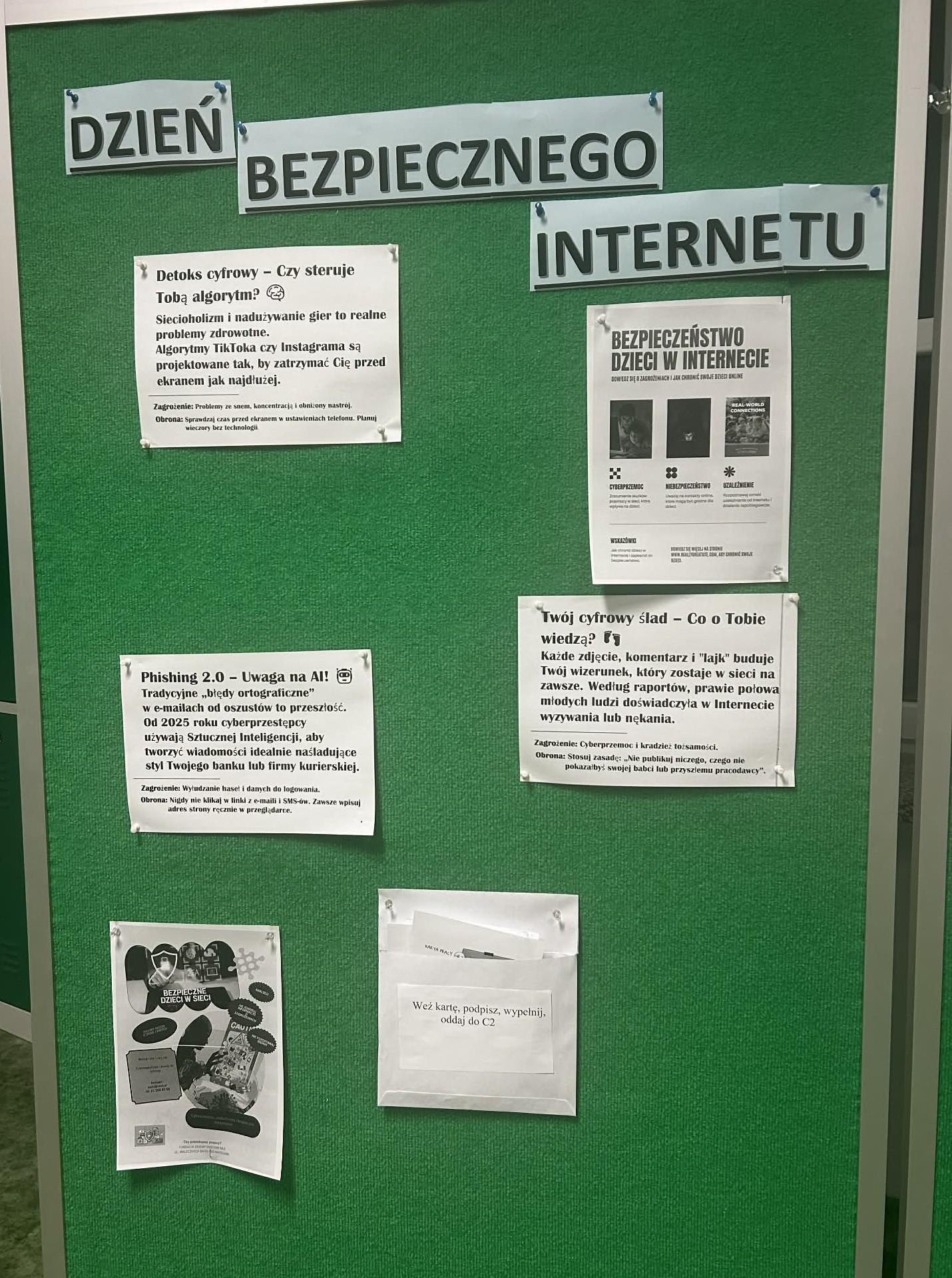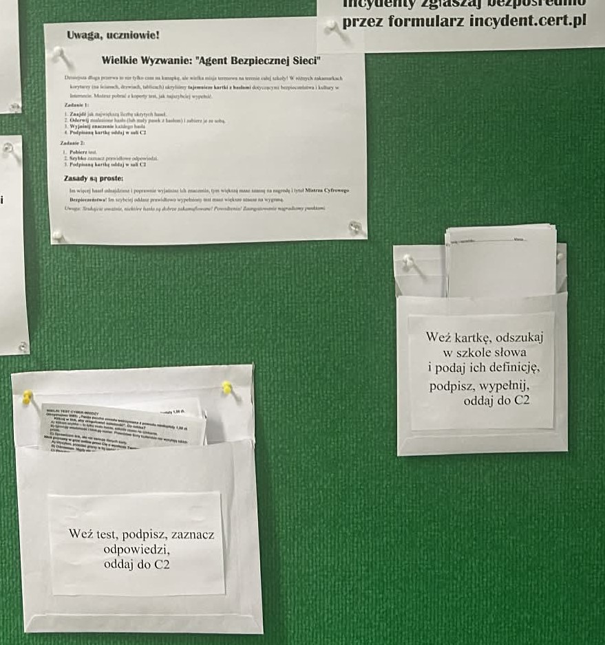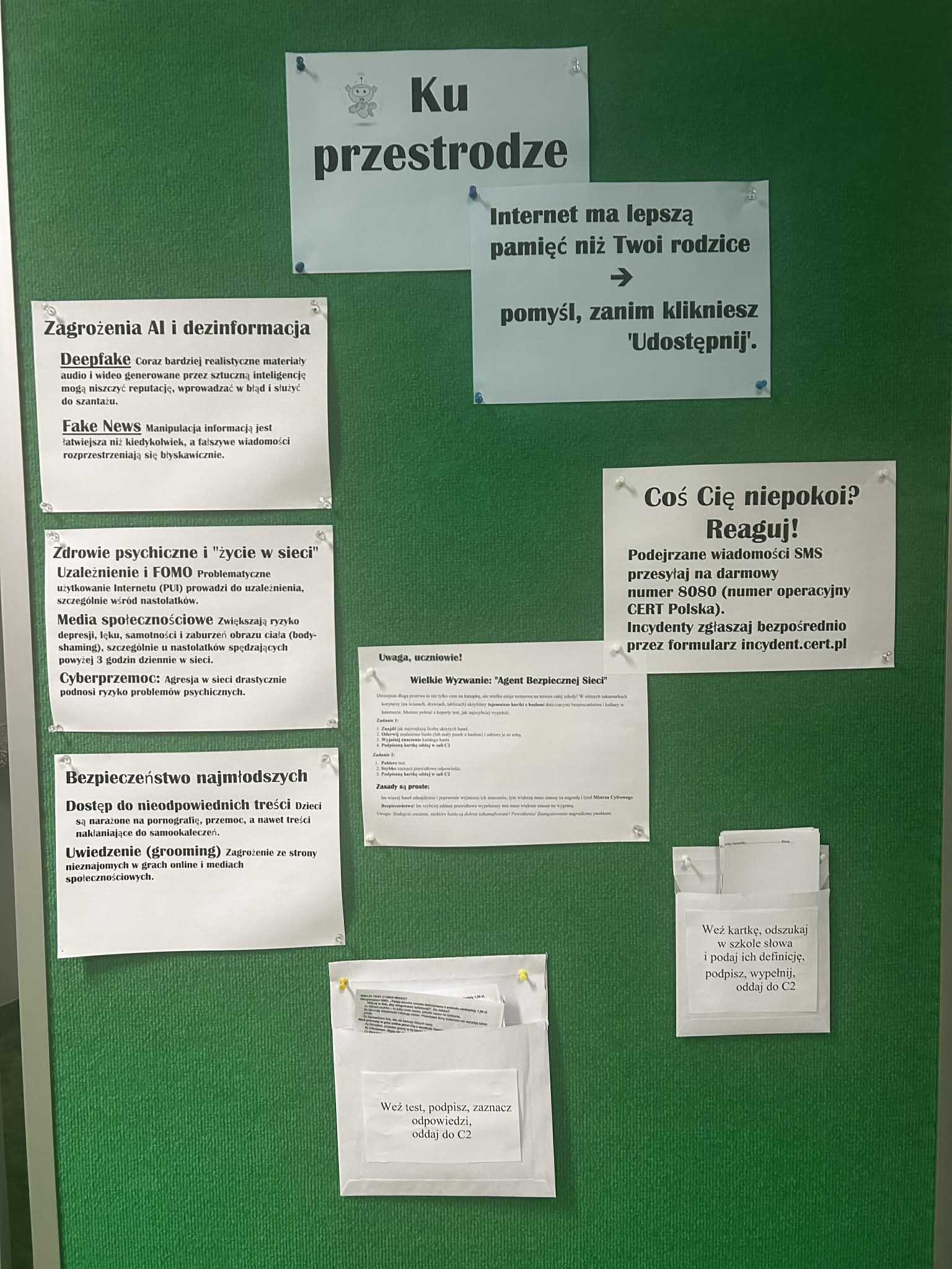 Wielkie Wyzwania: Odważni sprawdzali wiedzę w „Wielkim Teście Cyber”, a cała szkoła tętniła życiem podczas misji terenowej „Agent Bezpiecznej Sieci”. Uczniowie z wypiekami na twarzach tropili ukryte na korytarzach i drzwiach tajemnicze hasła. Ogromna radość i zaangażowanie uczniów udowodniły, że bycie świadomym użytkownikiem sieci to misja, którą nasi wychowankowie przyjmują z entuzjazmem.